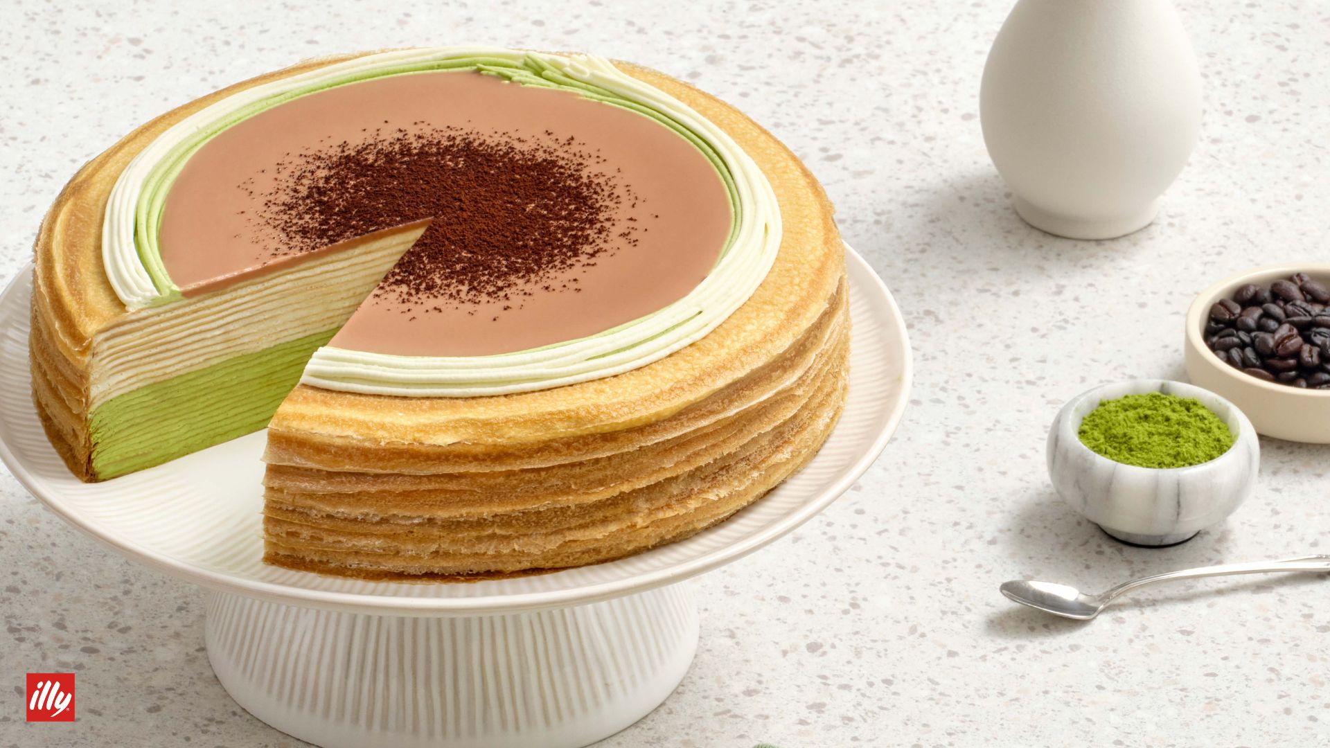 For the one who’s fueled by gratitude and really good coffee. Silky layers of coffee cream and green tea cream are finished with a glossy coffee glaze, an irresistible collaboration between Lady M and illy Coffee.