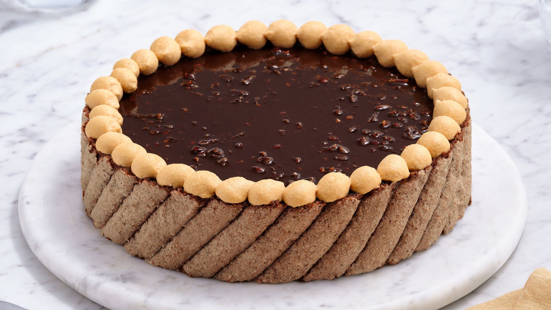 Decadent and rich, this chocolate hazelnut creation is a must for dessert lovers. Layers of hazelnut biscuit, feuilletine, and mousse create the perfect finale.